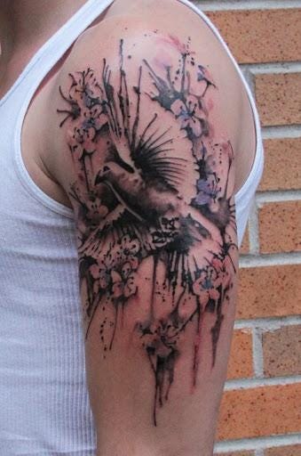 1. Mẫu hình xăm chim bồ câu kết hợp với các bông hoa nhỏ là ý tưởng được thiết kế để xăm lên vai dành cho nam giới.